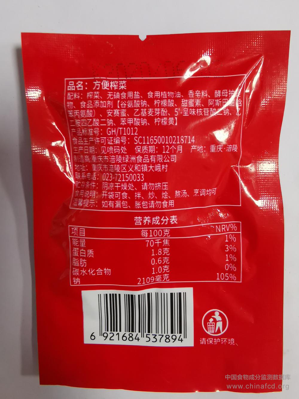 当前位置:预包装食品营养标签数据查询系统>>方便榨菜