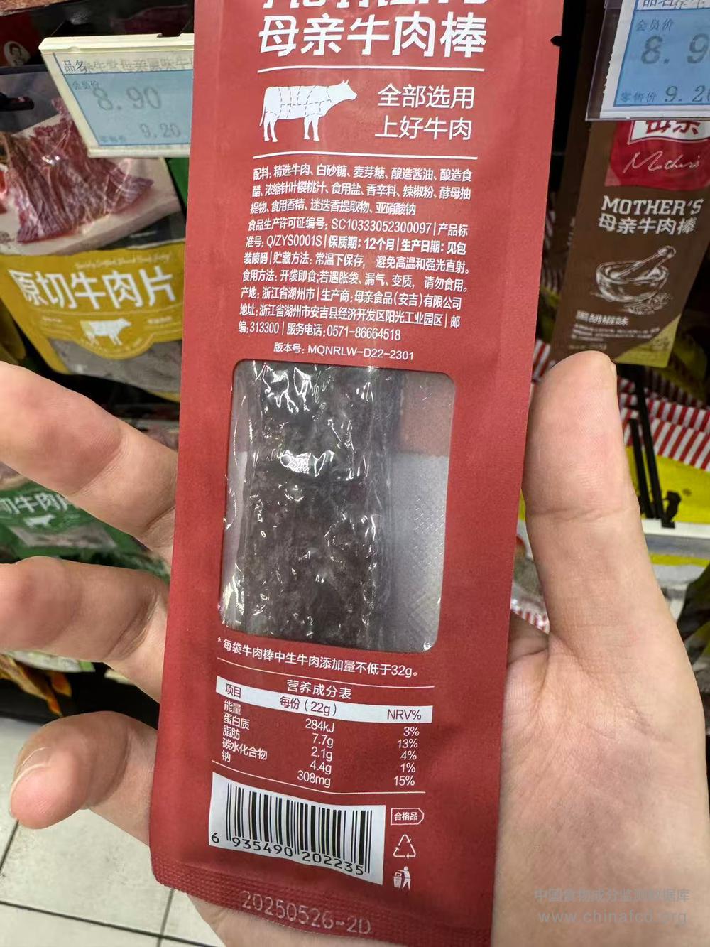 生产厂家:母亲食品(安吉)有限公司 品牌:母亲 食物类别:畜肉类及制品-牛-牛肉制品-熟肉干制品(肉松类、肉干类、肉脯类) 配料:精选牛肉、白砂糖、麦芽糖、酿造酱油、酿造食醋,浓缩针叶樱桃汁、食用盐、香辛料、辣椒粉、酵母抽提物、食用香精、迷迭香提取物、亚硝酸钠 净含量:22g 条形码/识别码:693549020235 储存方法:置于阴凉干燥处,避免日光直射,严禁挤压拉撕 产地:浙江省湖州市