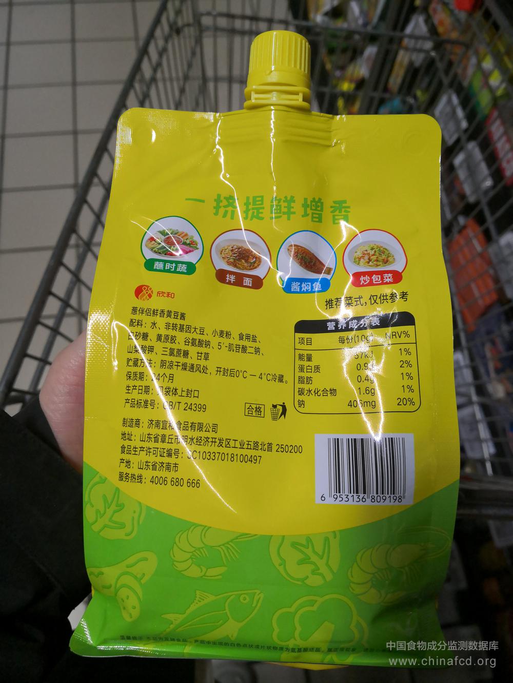 生产厂家:济南宜和食品有限公司 品牌:欣和 食物类别:调味品类-酱及酱制品 配料:水、非转基因大豆、小麦粉、食用盐、白砂糖、黄原胶、谷氨酸钠、5‘-肌苷酸二钠、山梨酸钾、三氯蔗糖、甘草 净含量:1kg 条形码/识别码:6953136809198 储存方法:阴凉干燥通风处,开封后0℃一4℃冷藏 产地:山东省济南市