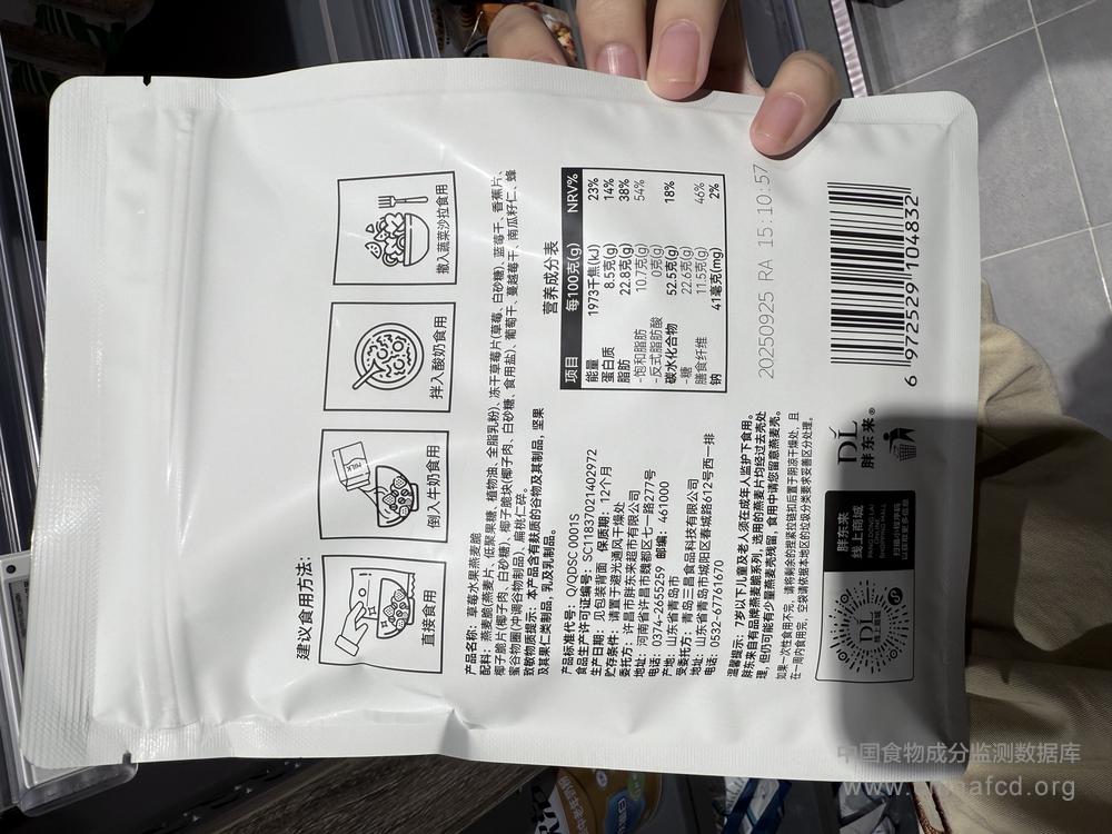 生产厂家:青岛三昌食品科技有限公司 品牌:DL自营 食物类别:谷类及制品-小麦-其他制品 配料:燕麦脆(燕麦片、低聚果糖、植物油、全脂乳粉)、冻干草莓片(草莓、白砂糖)、蓝莓干、香蕉片、椰子脆片(椰子肉、白砂糖)、椰子脆块(椰子肉、白砂糖、食用盐)、葡萄干、蔓越莓干、南瓜籽仁、蜂蜜谷物圈(冲调谷物制品)、扁桃仁碎。 净含量:320g 条形码/识别码:6972529104832 储存方法:请置于阴凉干燥处、避免阳光直射 产地:山东省青岛市