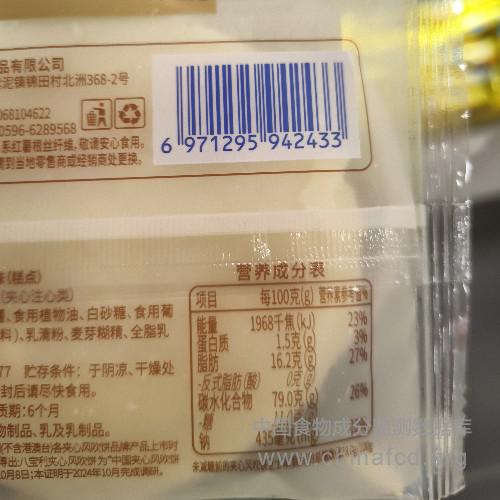 生产厂家:龙海市八宝利食品有限公司 品牌:八宝利 食物类别:休闲食品-饼干、面包-饼干-夹心及装饰类 配料:食用木薯淀粉,红薯,食用植物油,白砂糖,食用葡萄糖,芝士调味粉(复合调味料),乳清粉,麦芽糊精,全脂乳粉,食用盐 净含量:散装称重 条形码/识别码:6971295942433 储存方法:于阴凉、干燥处贮藏,避免高温阳光暴晒。开封后请尽快食用 产地:福建省漳州市
