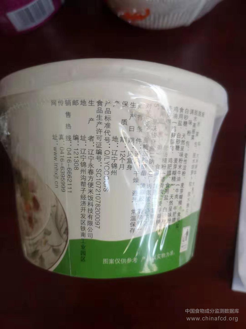 生产厂家:辽宁永春方便米饭科技有限公司 品牌:春缘 食物类别:速食食品-方便食品-即食谷物-粥/羹类(八宝粥等) 配料:大米粥体:大米;脱水菜包:脱水胡萝卜粒、脱水葱片、脱水高丽菜;调味粉包:变性淀粉、麦芽糊精、食用盐、白砂糖、天然呈味粉末牛油、天然呈味粉末鸡油、老汤精粉、食品添加剂。 净含量:57克 条形码/识别码:6952449400023 储存方法:通风、干燥、避光、常温保存。 产地:辽宁省锦州市