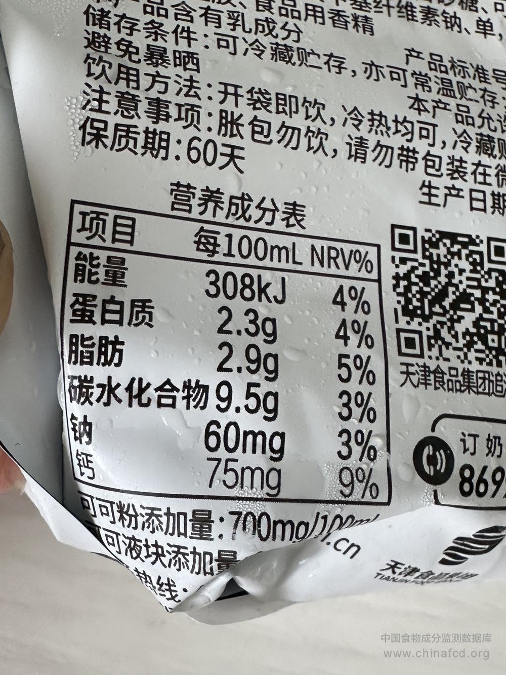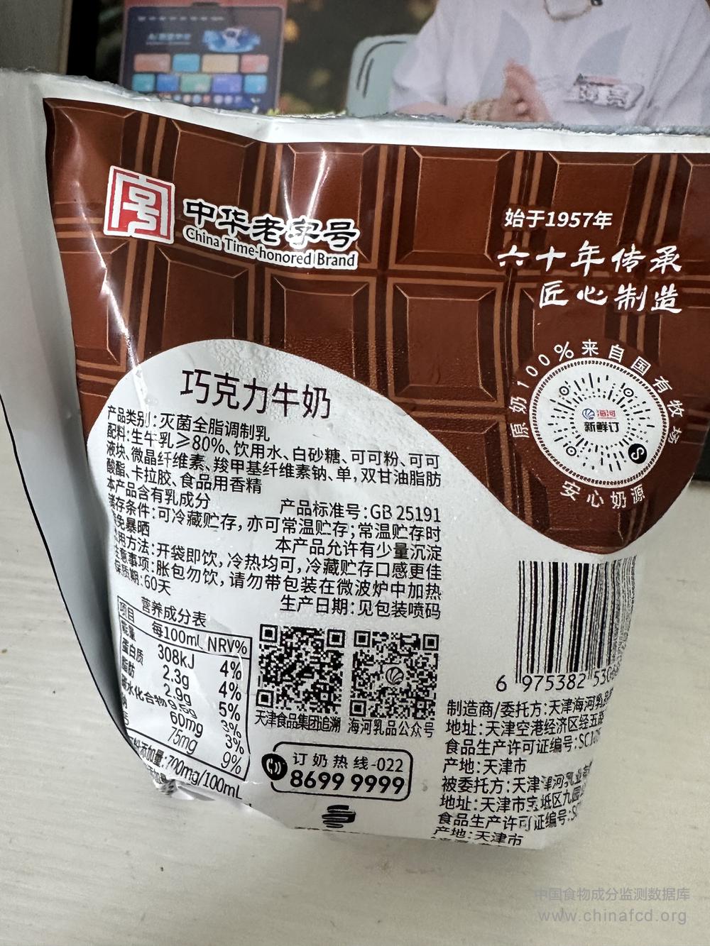 生产厂家:天津海河乳品有限公司 品牌:海河 食物类别:乳类及制品-液态乳--调制乳 配料:生牛乳≥80%、饮用水、白砂糖、可可粉、可可液块、微晶纤维素、羧甲基纤维素钠、单,双甘油脂肪酸酯、卡拉胶、食品用香精 净含量:220毫升 条形码/识别码:6975382530688 储存方法:可冷藏贮存,亦可常温贮存;常温贮存时避免暴晒 产地:天津市