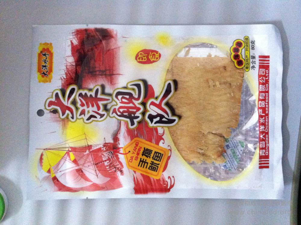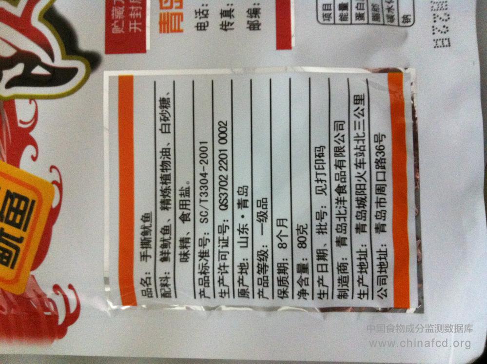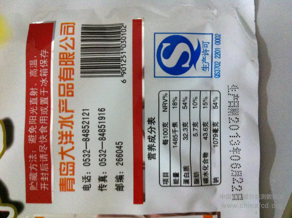生产厂家:青岛北洋食品有限公司 品牌:大洋水手大洋舰队 食物类别:水产类-其它--熏烤水产品 配料:鲜鱿鱼、精炼植物油、白砂糖、味精、食用盐 净含量:80g 条形码/识别码:6901251030102 储存方法:避免高温、阳光直射、开封后尽快食用或置于冰箱保存 产地:山东省青岛市