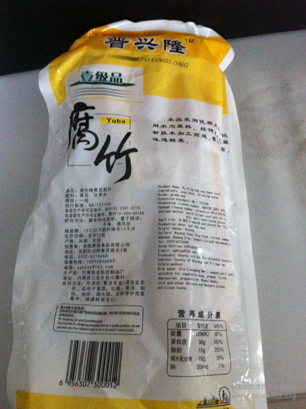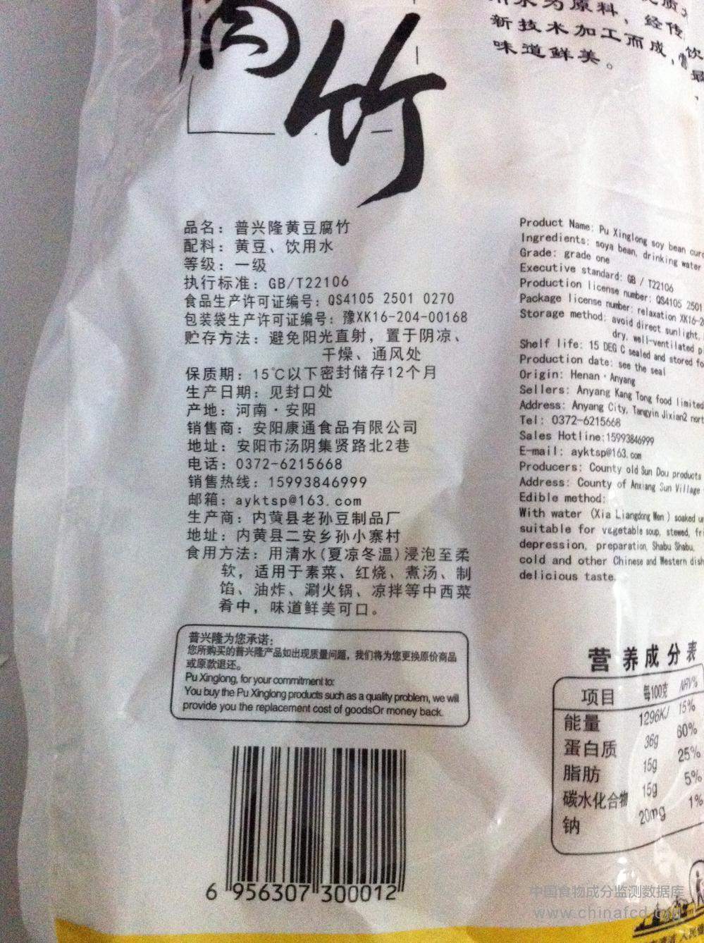 当前位置:预包装食品营养标签数据查询系统>>普兴隆腐竹