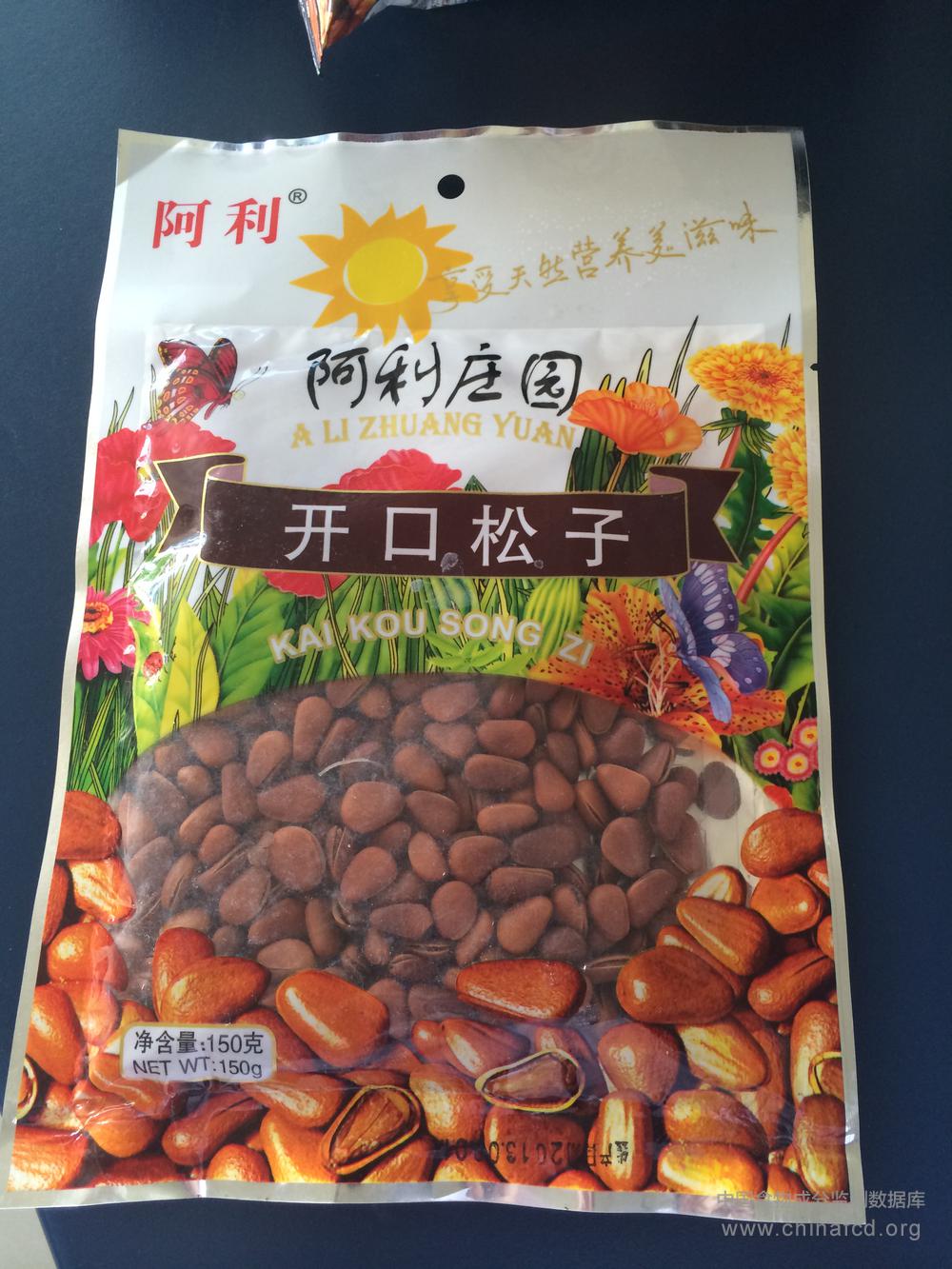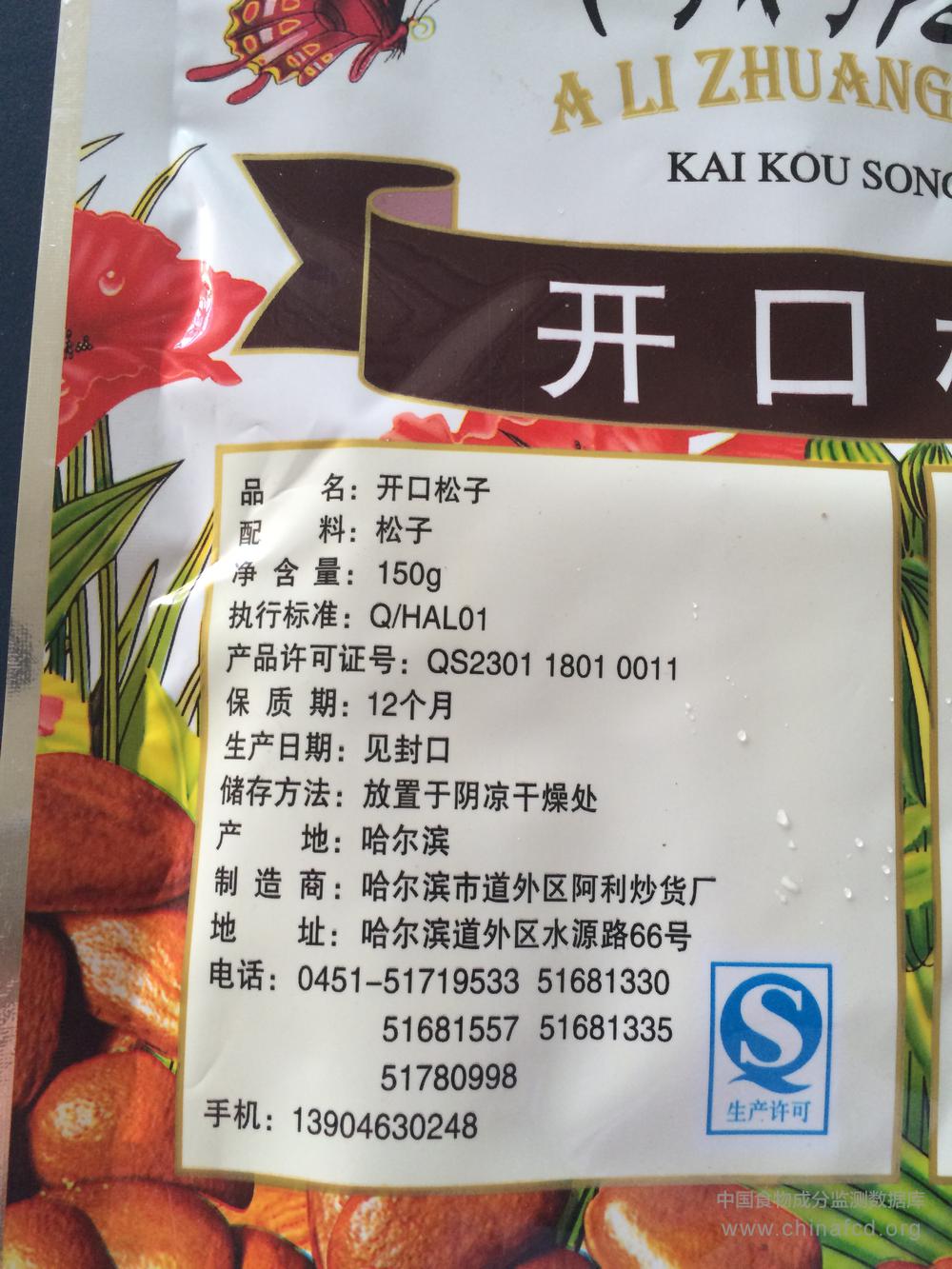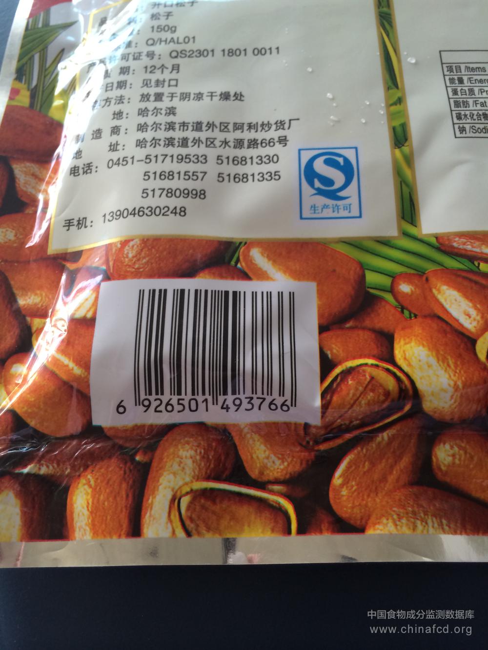 生产厂家:哈尔滨市道外区阿利炒货区 品牌:阿利 食物类别:坚果、种子类-树坚果--松子 配料:松子 净含量:150g 条形码/识别码:6926501493766 储存方法:放置于阴凉干燥处 产地:黑龙江省哈尔滨市