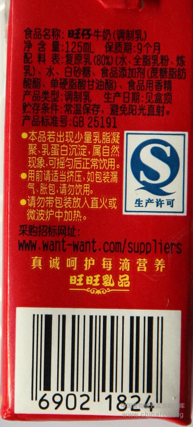 生产厂家:石家庄明旺乳业有限公司 品牌:旺仔 食物类别:乳类及制品-液态乳--调制乳 配料:复原乳(80%)(水、全脂乳粉、炼乳)、水、白砂糖、食品添加剂(蔗糖脂肪酸酯、单硬脂酸甘油酯)、食品用香精 净含量:125ML 条形码/识别码:69031824 储存方法:常温、避免阳光直射 产地:河北省石家庄市行唐县食品工业区北区1号
