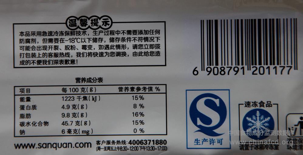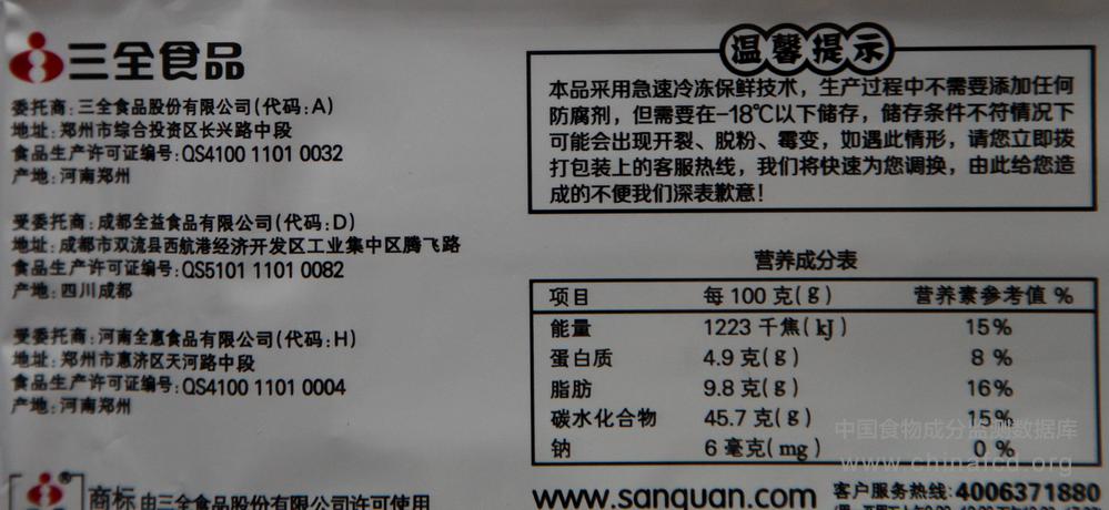生产厂家:河南全惠食品有限公司 品牌:三全 食物类别:速食食品-方便食品-冷冻米面制品-汤圆元宵等 配料:白糯米粉、水、黑芝麻、速冻食品专用油(植物油、单甘油硬脂酸酯)、白砂糖、麦芽糊精、淀粉、食品添加剂(瓜尔胶、黄原胶)黑芝麻添加量:10% 净含量:320克 条形码/识别码:6908791201177 储存方法:18℃以下冷冻保存 产地:郑州市惠济区天河路中段