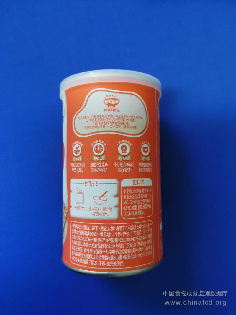 生产厂家:鹤山市嘉士威食品有限公司 品牌:秋田满满 食物类别:休闲食品-饼干、面包-饼干-其他 配料:小麦粉,海藻糖,植物油,食用玉米淀粉,浓缩苹果汁,无水奶油,全脂乳粉,碳酸氢钠,碳酸氢钠,钙,铁,锌,维生素B1 净含量:130g 条形码/识别码:6970250435911 储存方法:请置于阴凉干燥避光处保存 产地:广东省江门市