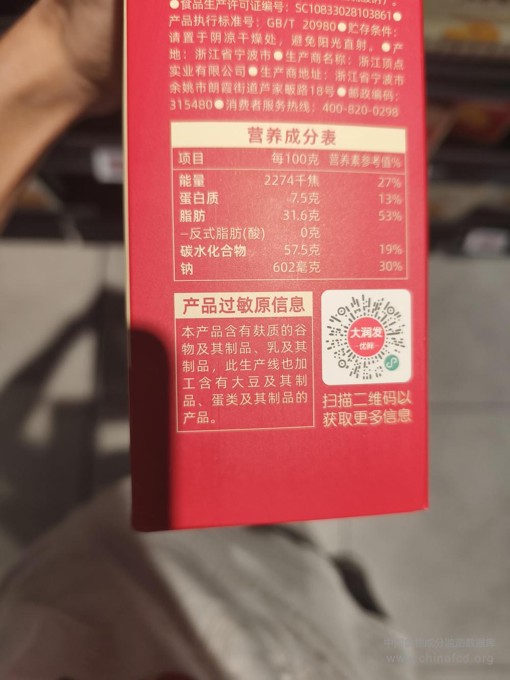 生产厂家:浙江顶点实业有限公司 品牌:润发甄选 食物类别:休闲食品-饼干、面包-饼干-夹心及装饰类 配料:小麦粉(≥40%),植物油,白砂糖,食用油脂制品,芝士粉(干酪)(≥6%),乳清粉,全脂乳粉(≥2%),植脂末,麦芽糖浆,淀粉,食用盐,食品添加剂(碳酸氢铵,碳酸氢钠,磷酸二氢钙,β-胡萝卜素,焦亚硫酸钠) 净含量:216g 条形码/识别码:6970425865703 储存方法:请置于阴凉干燥处,避免阳光直射。 产地:浙江宁波