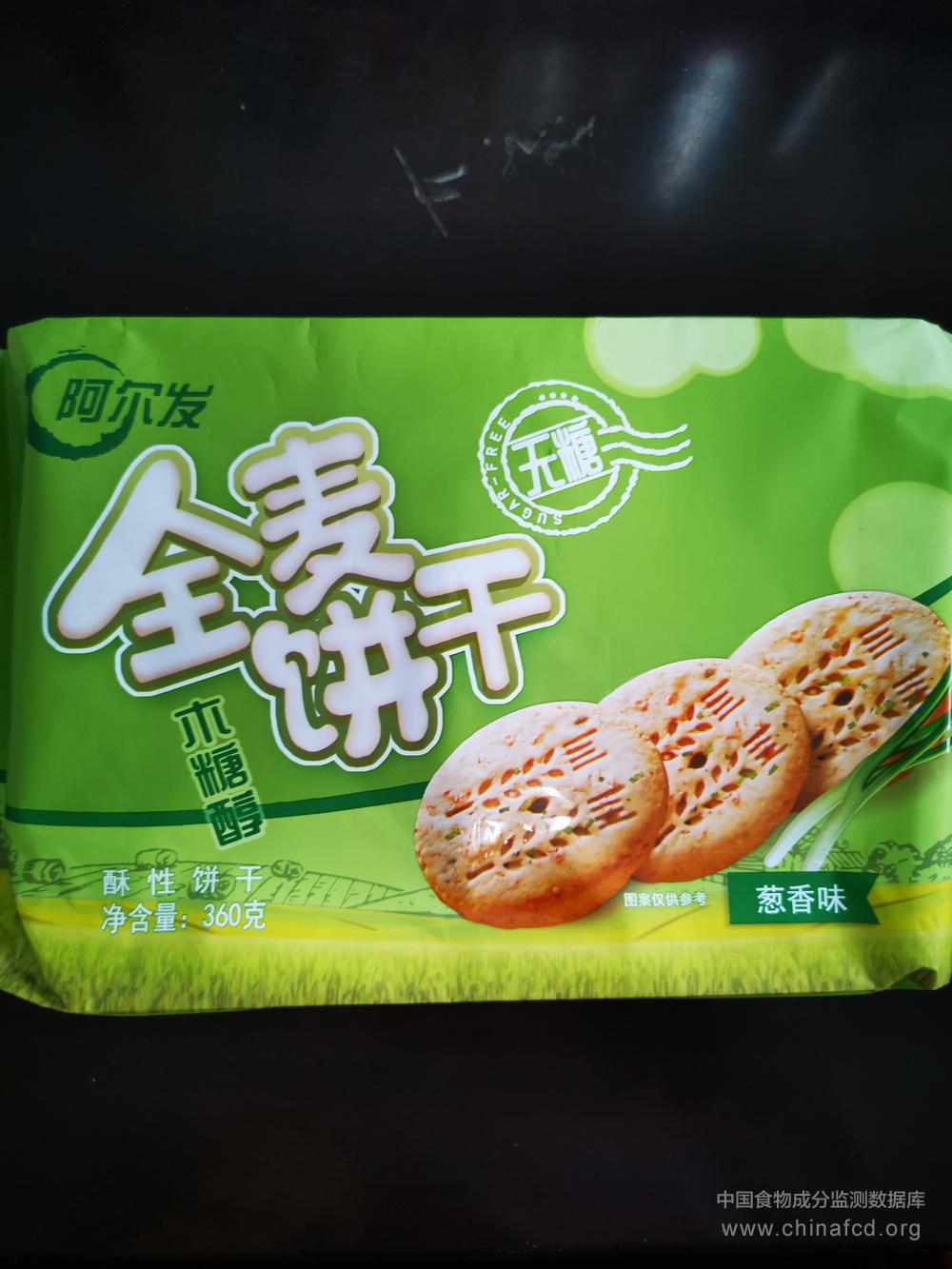 生产厂家:天津阿尔发保健品有限公司 品牌:阿尔发 食物类别:休闲食品-饼干、面包-饼干-其他 配料:小麦粉、食品添加剂 (麦芽糖醇液、碳酸氢铵、木糖醇(≥1%)、碳酸氢钠、大豆磷脂、三氯蔗糖、谷氨酸钠)、食用植物油、食用淀粉、食用小麦麸皮、全麦糖(≥0.5%)、葱粉、食用盐、食用品香精) 净含量:360g 条形码/识别码:6913405660530 储存方法:阴凉干燥 产地:天津经济技术开发区