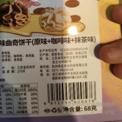 生产厂家:颂爱食品(苏州)有限公司 品牌:AKOKO 食物类别:休闲食品-饼干、面包-饼干-曲奇 配料:小麦粉,黄油,食用玉米淀粉,糖霜,可可粉,咖啡粉,食用盐 净含量:68克 条形码/识别码:6971099920576 储存方法:存放于阴凉干燥处 产地:江苏省苏州市