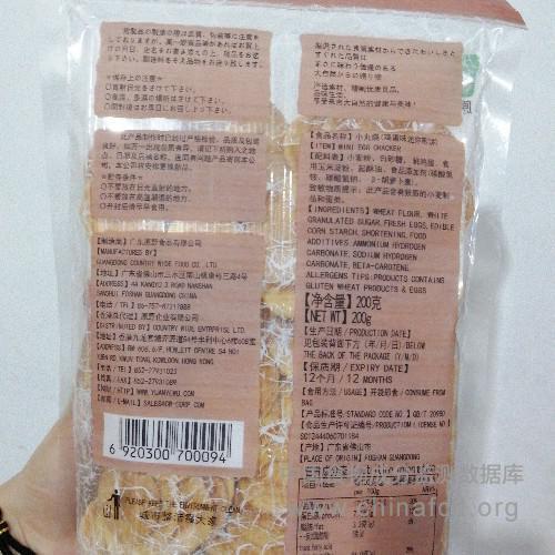 生产厂家:广东原野食品有限公司 品牌:原野物语 食物类别:休闲食品-饼干、面包-饼干-蛋卷 配料:小麦粉、白砂糖、鲜鸡蛋、食用玉米淀粉、起酥油、食品添加剂(碳酸氢铵、碳酸氢钠、 β﹣胡萝卜素) 净含量:200 条形码/识别码:6920300700094 储存方法:置于阴凉干燥处,避免阳光直射 产地:广东省佛山市