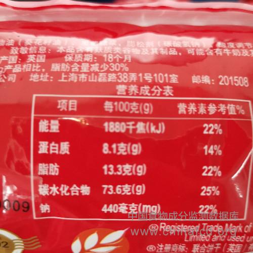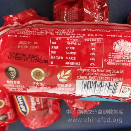 生产厂家:United Biscuits(UK) Limited 品牌:麦维他 McVities 食物类别:休闲食品-饼干、面包-饼干-其他 配料:小麦粉,白砂糖,全麦粉,植物油(葵花籽油),葡萄糖浆,膨松剂(碳酸氢钠),酸度调节剂(DL-苹果酸),乳化剂(双乙酰酒石酸单双甘油酯),食用盐) 净含量:250g 条形码/识别码:5000168037981https://nlc.chinanutri.cn/upload/images/source/HB13002023-0013/202301060936284102.jpg 储存方法:阴凉通风干燥 产地:英国