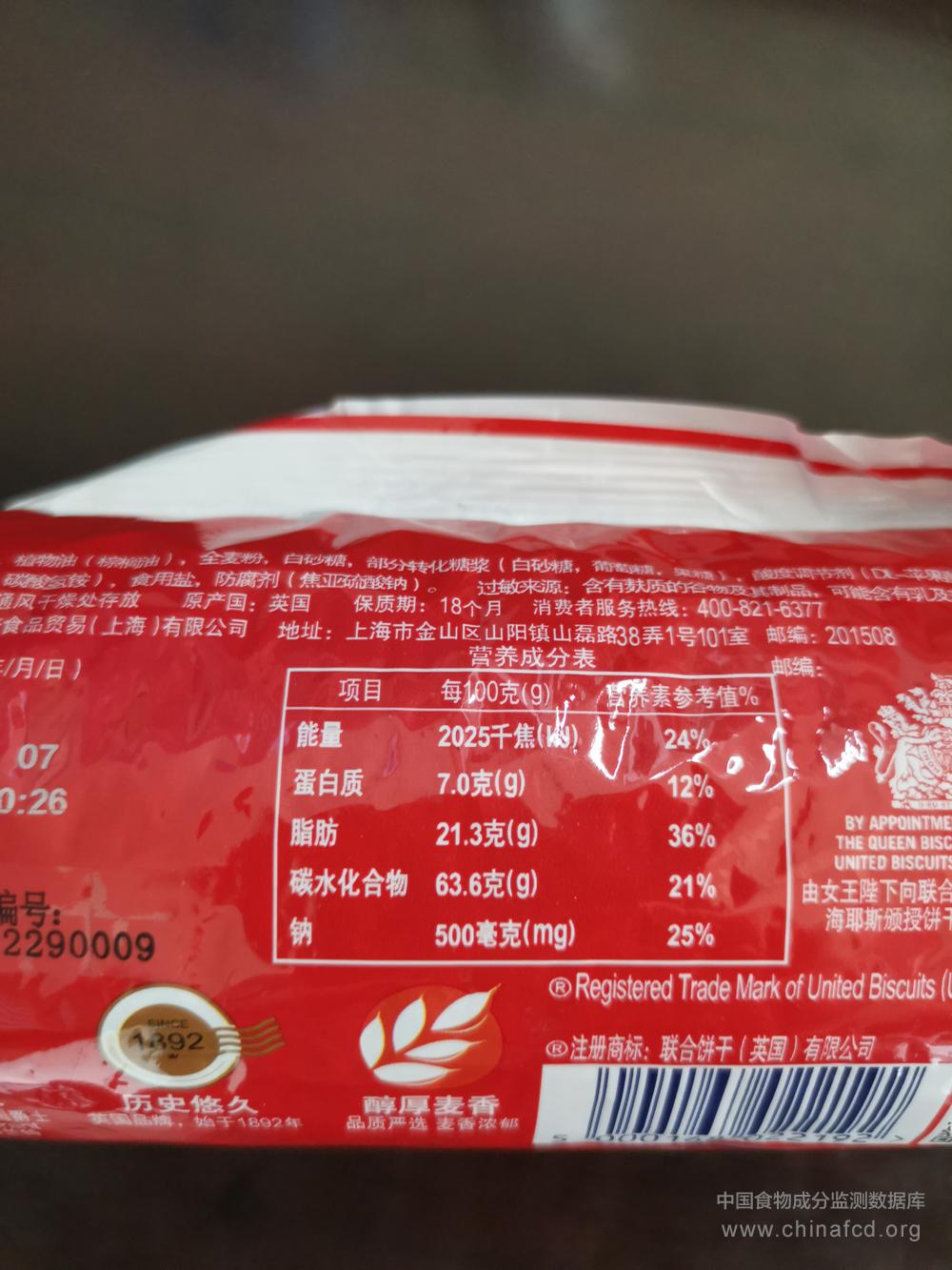 生产厂家:誉焙食品贸易(上海)有限公司 品牌:麦维他 食物类别:休闲食品-饼干、面包-饼干-其他 配料:小麦粉,植物油(棕榈油),全麦粉,白砂糖,部分转化糖浆(白砂糖、葡萄糖、果糖),酸度调节剂(DL-苹果酸),膨松剂(碳酸氢钠、碳酸氢铵),食用盐,防腐剂(焦亚硫酸钠)。 净含量:250g 条形码/识别码:5000168022192 储存方法:阴凉干燥 产地:上海市山磊路38弄1号101室