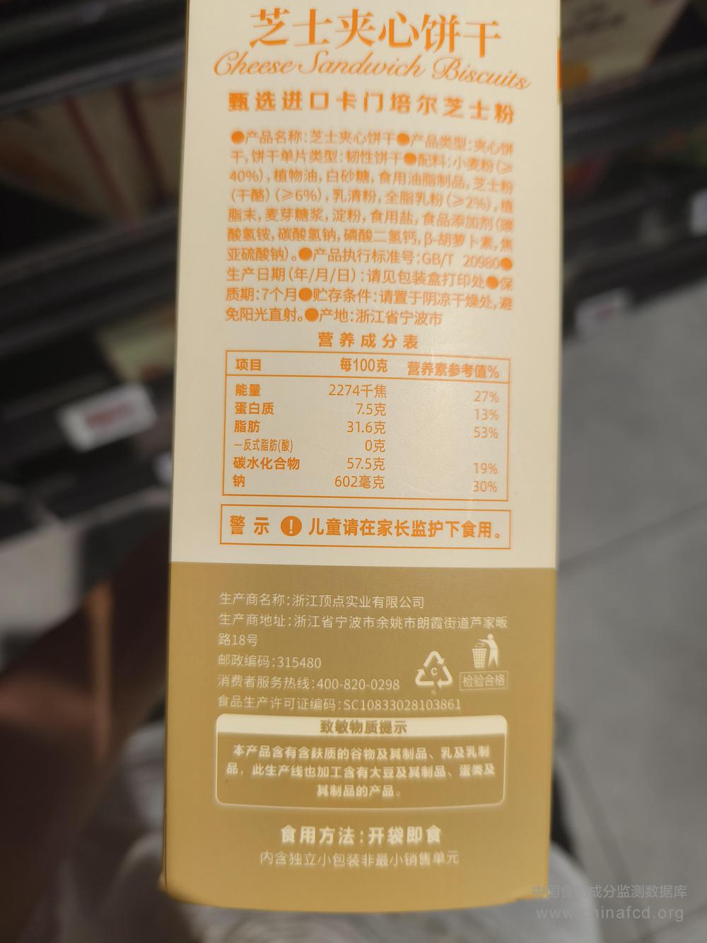 生产厂家:浙江顶点实业有限公司 品牌:好麦 食物类别:休闲食品-饼干、面包-饼干-夹心及装饰类 配料:小麦粉(≥40%),植物油,白砂糖,食用油脂制品,芝士粉(干酪)(≥6%),乳清粉,全脂乳粉(≥2%),植脂末,麦芽糖浆,淀粉,食用盐,食品添加剂(碳酸氢铵,碳酸氢钠,磷酸二氢钙,β-胡萝卜素,焦亚硫酸钠) 净含量:216g 条形码/识别码:6970425865161 储存方法:请置于阴凉干燥处,避免阳光直射。 产地:浙江宁波