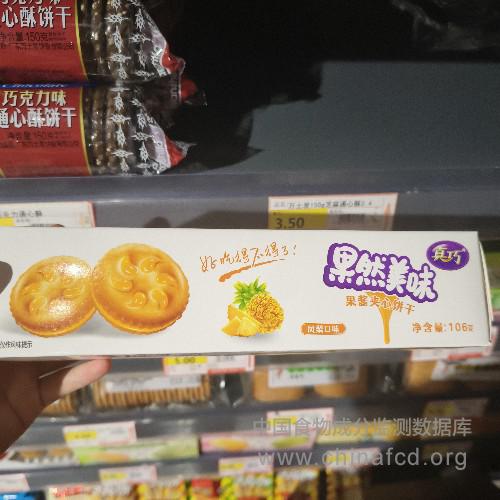 配料:小麦粉,植物油,夹心馅料[果葡糖浆,葡萄糖浆,白砂糖,甘油,凤梨果味酱,复配增稠剂(羟丙基二淀粉磷酸酯,卡拉胶,柠檬酸钾,羧甲基纤维素钠,海藻酸钠,磷酸二氢钾,蔗糖脂肪酸酯),浓缩凤梨果汁,食用香精,果胶,柠檬酸],白砂糖,人造奶油(非氢化),麦芽糖浆,食品添加剂(碳酸氢铵,碳酸氢钠,焦磷酸二氢二钠,焦亚硫酸钠,磷酸二氢钠,磷酸氢钙,黄原胶,单,双甘油脂肪酸酯,辣椒红),食用盐