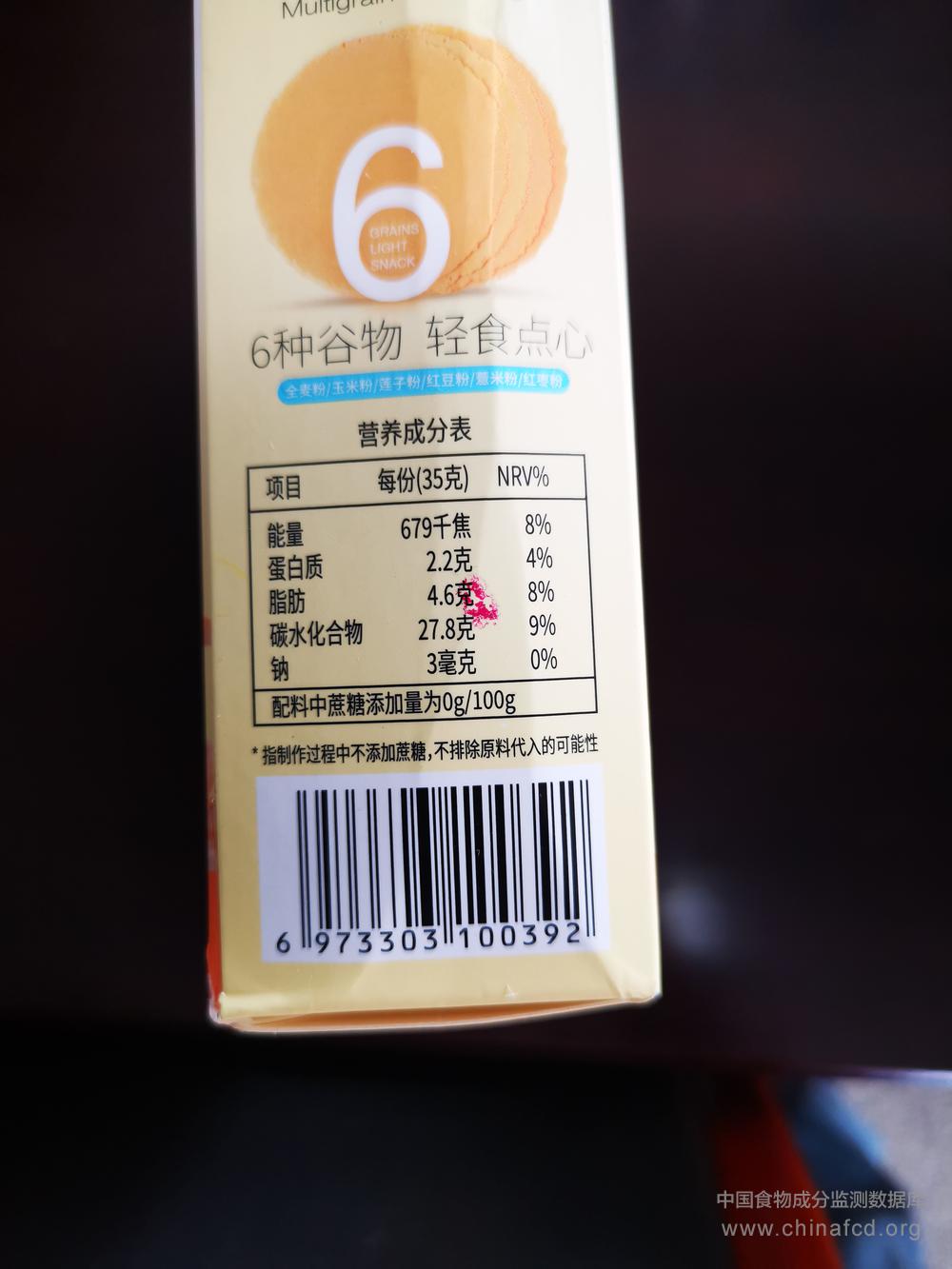 生产厂家:邓州市正禾食品厂 品牌:小友鸣棠 食物类别:休闲食品-饼干、面包-饼干-其他 配料:全麦粉、玉米粉、莲子粉、红豆粉、薏米粉、红枣粉、植物油、木糖醇。 净含量:140g 条形码/识别码:6973303100392 储存方法:阴凉干燥 产地:河南省南阳市