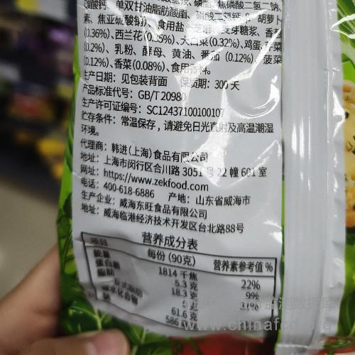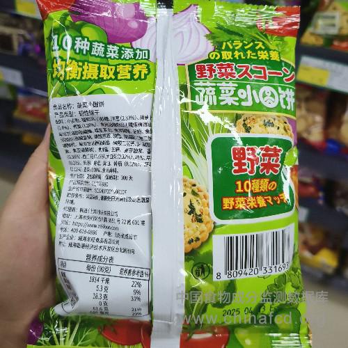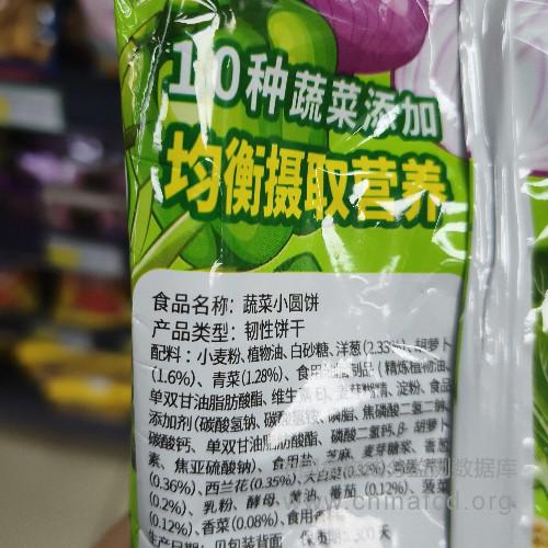 配料:小麦粉、植物油、白砂糖、洋葱(2.33%)、胡萝卜(1.6%)、青菜(1,28%)、食用油脂制品(精炼植物油、 单双甘油脂肪酸酯、维生素E)、麦芽糊精、淀粉、食品添加剂(碳酸氢钠、碳酸氢铵、磷脂、焦磷酸二氢二钠、碳酸钙、单双甘油脂肪酸酯、磷酸二氢钙、β-胡萝卜素、焦亚硫酸钠)、食用盐、芝麻、麦芽糖浆、香葱 (0.36%)、西兰花(0.35%)、大白菜(0.32%)、鸡蛋、芹菜(0.2%) 、 乳粉、酵母、黄油、番茄(0,12%)、菠菜 (0.12%)、香菜(0.08%)、食用香料。
