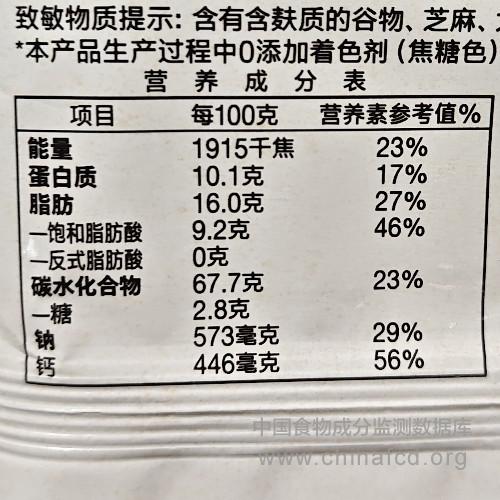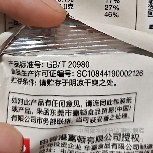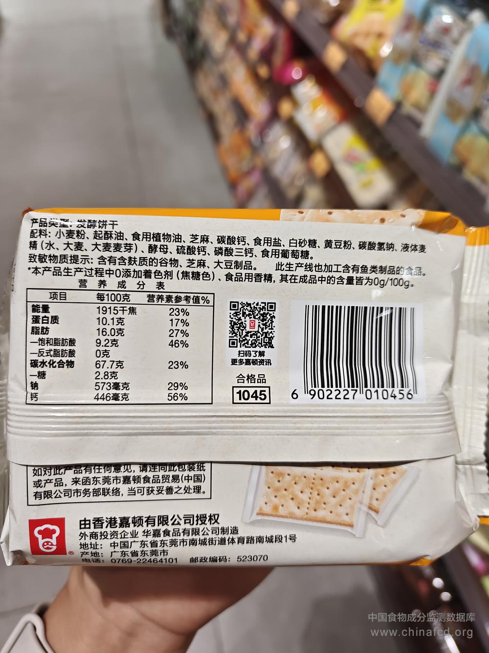 生产厂家:华嘉食品有限公司 品牌:嘉顿 食物类别:休闲食品-饼干、面包-饼干-梳达 配料:小麦粉、起酥油、食用植物油、芝麻、碳酸钙、食用盐、白砂糖、黄豆粉、碳酸氢钠、液体麦精(水、大麦、大麦麦芽)、酵母、硫酸钙、磷酸三钙、食用葡萄糖 净含量:105g 条形码/识别码:6902227010456 储存方法:请贮存于阴凉干爽之处 产地:广东省东莞市