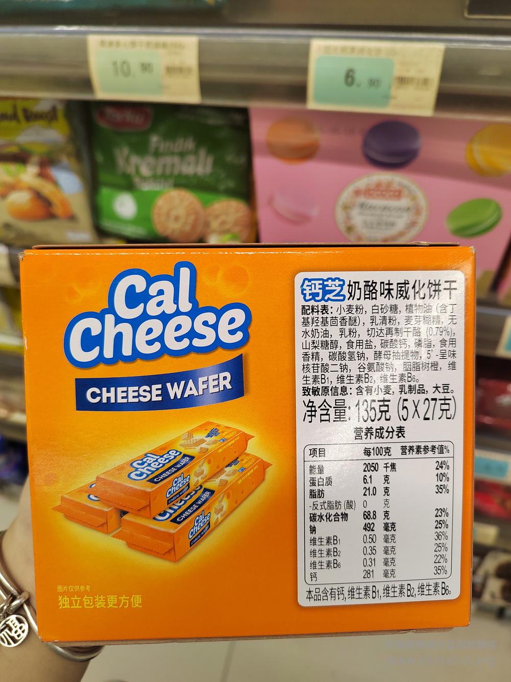 生产厂家:迈大食品(山东)有限公司 品牌:钙芝 食物类别:休闲食品-饼干、面包-饼干-威化饼干 配料:小麦粉,白砂糖,植物油(含丁基羟基茴香醚),乳清粉,麦芽糊精,无水奶油,乳粉,切达再制干酪(0.79%), 山梨糖醇,食用盐,碳酸钙,磷脂,食用香精,碳酸氢钠,酵母抽提物,5’-呈味核苷酸二钠,谷氨酸钠,胭脂树橙,维生素B1,维生素B2,维生素B6。 净含量:135g 条形码/识别码:8996001353028 储存方法:请置于阴凉干燥处 产地:山东省济南市