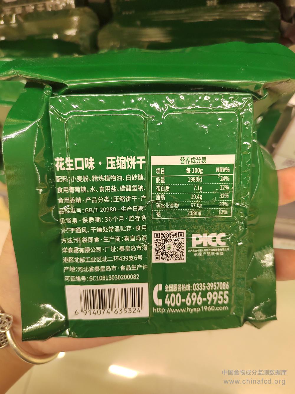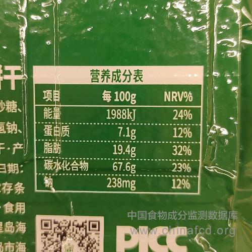 生产厂家:秦皇岛海洋食品有限公司 品牌:900 食物类别:休闲食品-饼干、面包-饼干-其他 配料:小麦粉、精炼植物油、白砂糖、食用葡萄糖、水、食用盐、碳酸氢钠、食用香精。 净含量:120g 条形码/识别码:6914074635324 储存方法:于通风、干燥处常温贮存 产地:河北省秦皇岛市