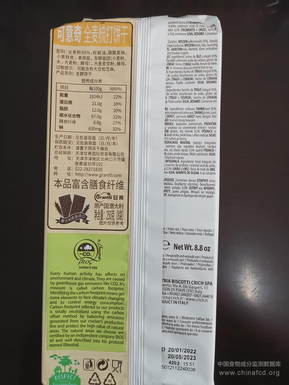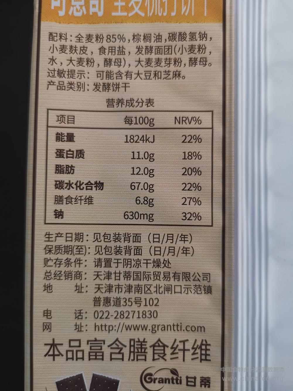 当前位置:预包装食品营养标签数据查询系统>>可意奇全麦梳打饼干