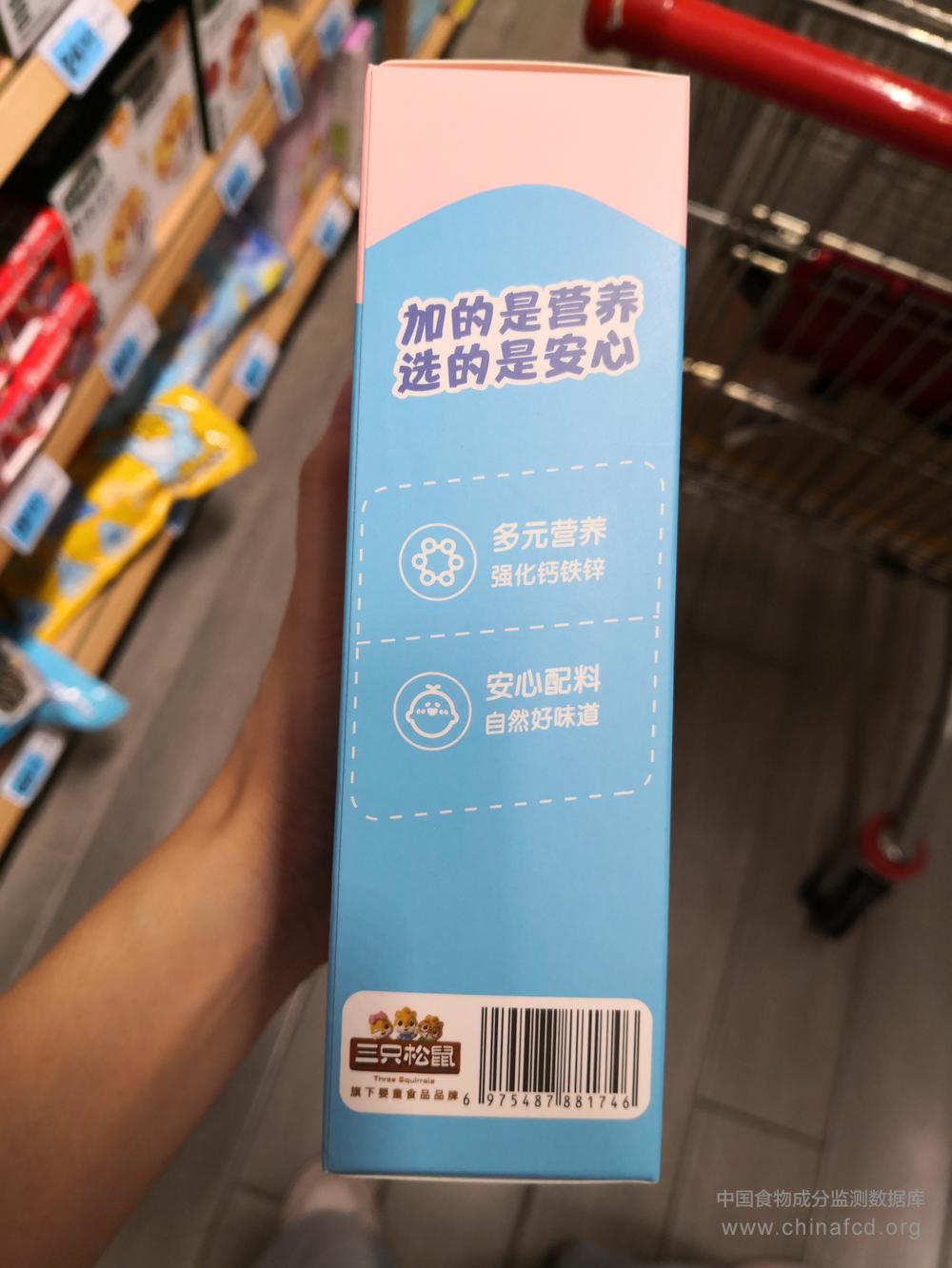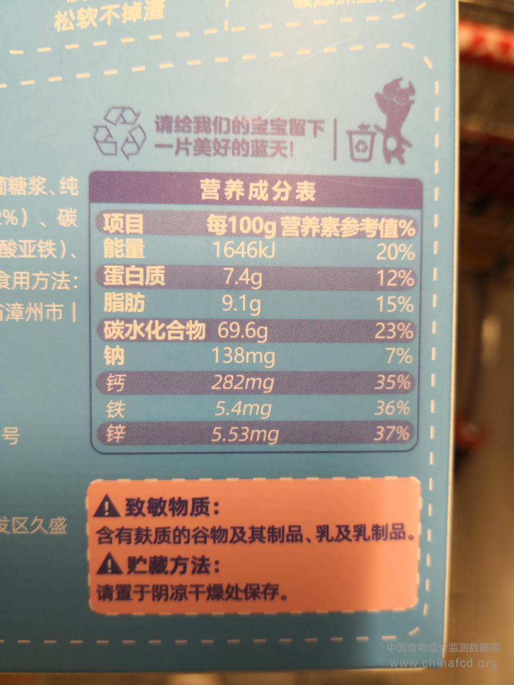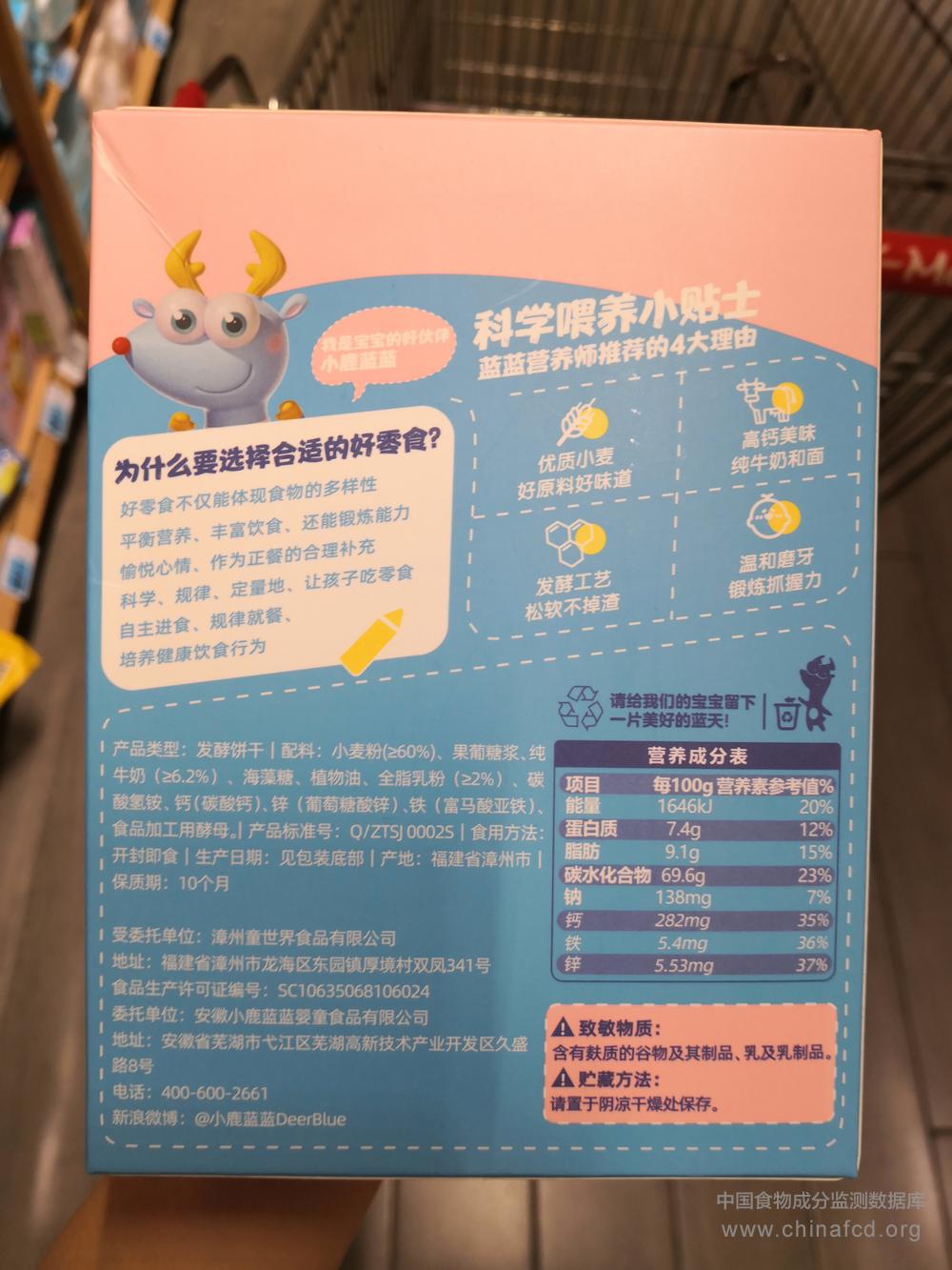 生产厂家:漳州童世界食品有限公司 品牌:小鹿蓝蓝 食物类别:休闲食品-饼干、面包-饼干-其他 配料:小麦粉(≥60%)、果葡糖浆、纯牛奶(≥6.2%)、海藻糖、植物油、全脂乳粉( ≥2%)、碳酸氢铵、钙(碳酸钙)、锌(葡萄糖酸锌)、铁(富马酸亚铁)、食品加工用酵母 净含量:60克 条形码/识别码:6975487881746 储存方法:请置于阴凉干燥处保存。 产地:福建省漳州市