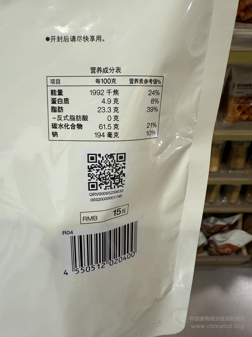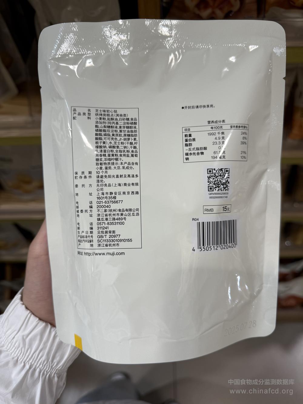 生产厂家:不二家(杭州)食品有限公司 品牌:MUJI无印良品 食物类别:休闲食品-饼干、面包-饼干-曲奇 配料:小麦粉,起酥油,白砂糖,食品 添加剂(羟丙基二淀粉磷酸酯,山梨糖醇液,麦芽糖醇液, 磷酸酯双淀粉,聚甘油脂肪酸酯,磷脂,黄原胶,蔗糖脂肪酸酯,可可壳色,β-胡萝卜素, 栀子黄),水,芝士粉(干酪,柠檬酸钠、磷酸氢二钠),干酪, 乳清蛋白粉,全脂乳粉,食品用香精,蛋黄粉,食用盐,葡萄糖浆,浓缩柠檬汁。 净含量:100克 条形码/识别码:4550512020400 储存方法:请避免阳光直射及高温多湿处。 产地:浙江省杭州市