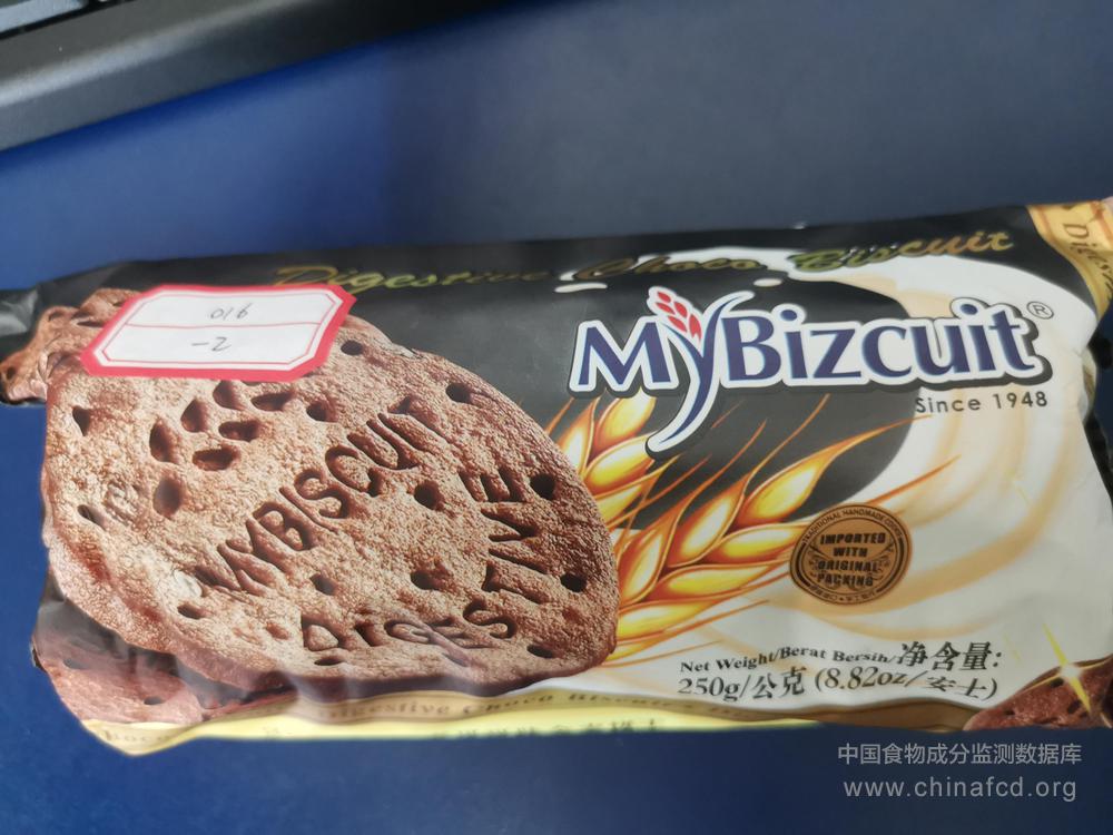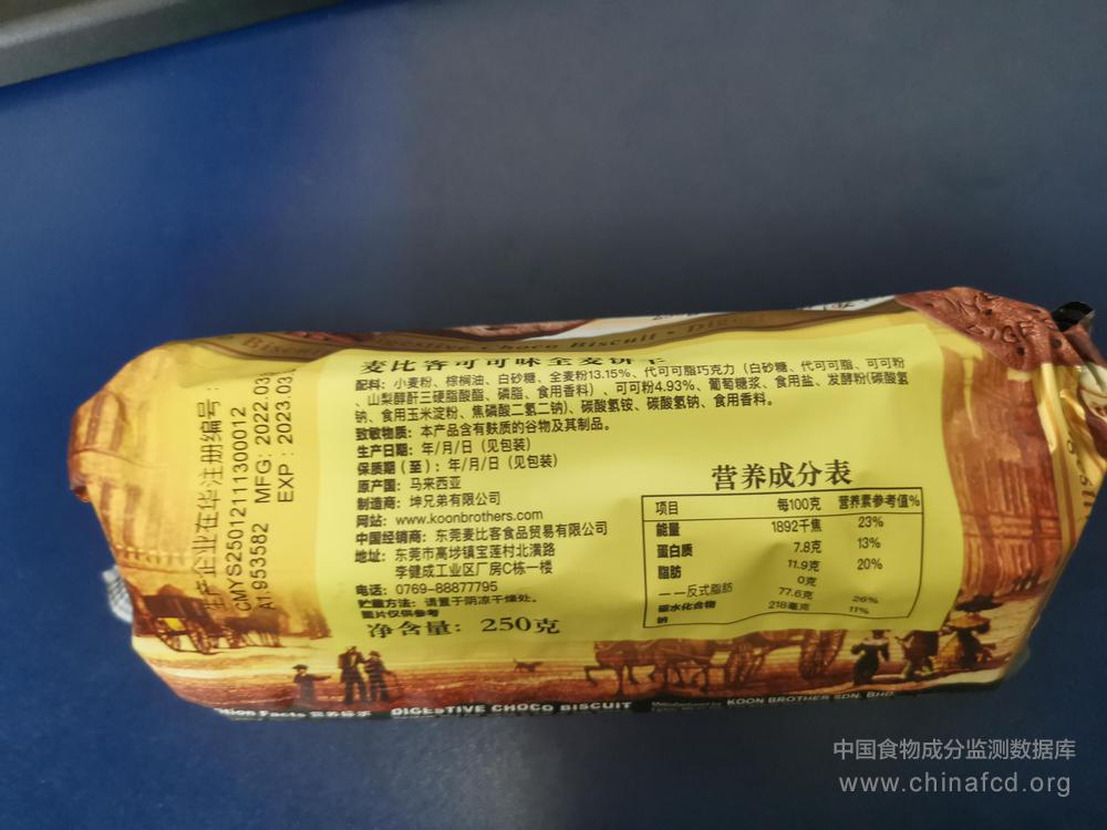 生产厂家:东莞麦比客食品贸易有限公司 品牌:麦比客 食物类别:休闲食品-饼干、面包-饼干-其他 配料:小麦粉,棕榈油,白砂糖,全麦粉13.15%,代可可脂巧克力(白砂糖、代可可脂、可可粉、山梨醇酐三硬酯酸脂、磷脂、食用香料),可可粉4.93%,葡萄糖浆,食用盐、发酵粉(碳酸氢钠、食用玉米淀粉、焦磷酸二氢二钠),碳酸氢铵,碳酸氢钠,食用香料 净含量:250g 条形码/识别码:9555480007311 储存方法:阴凉干燥 产地:马来西亚