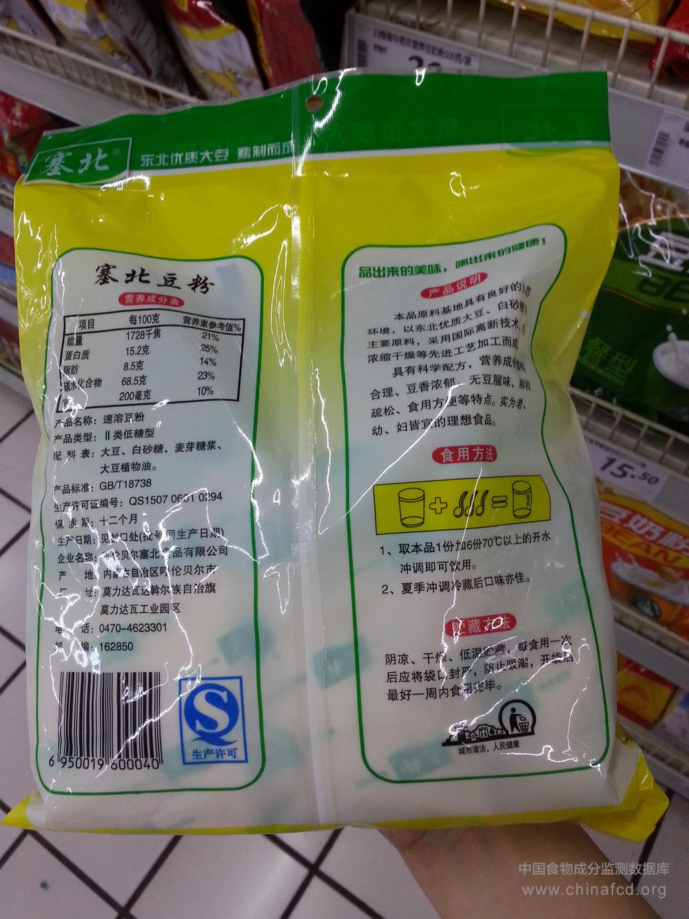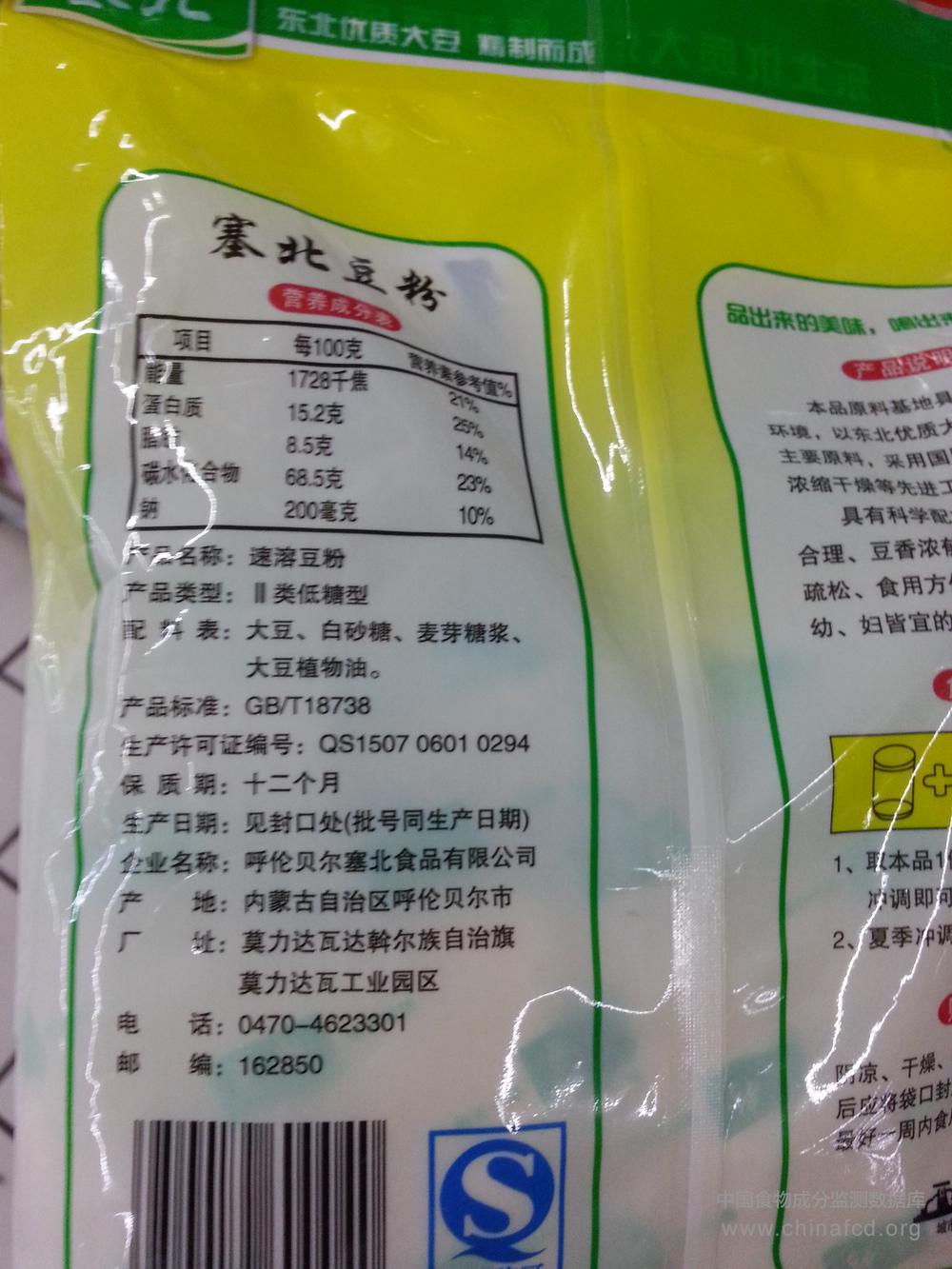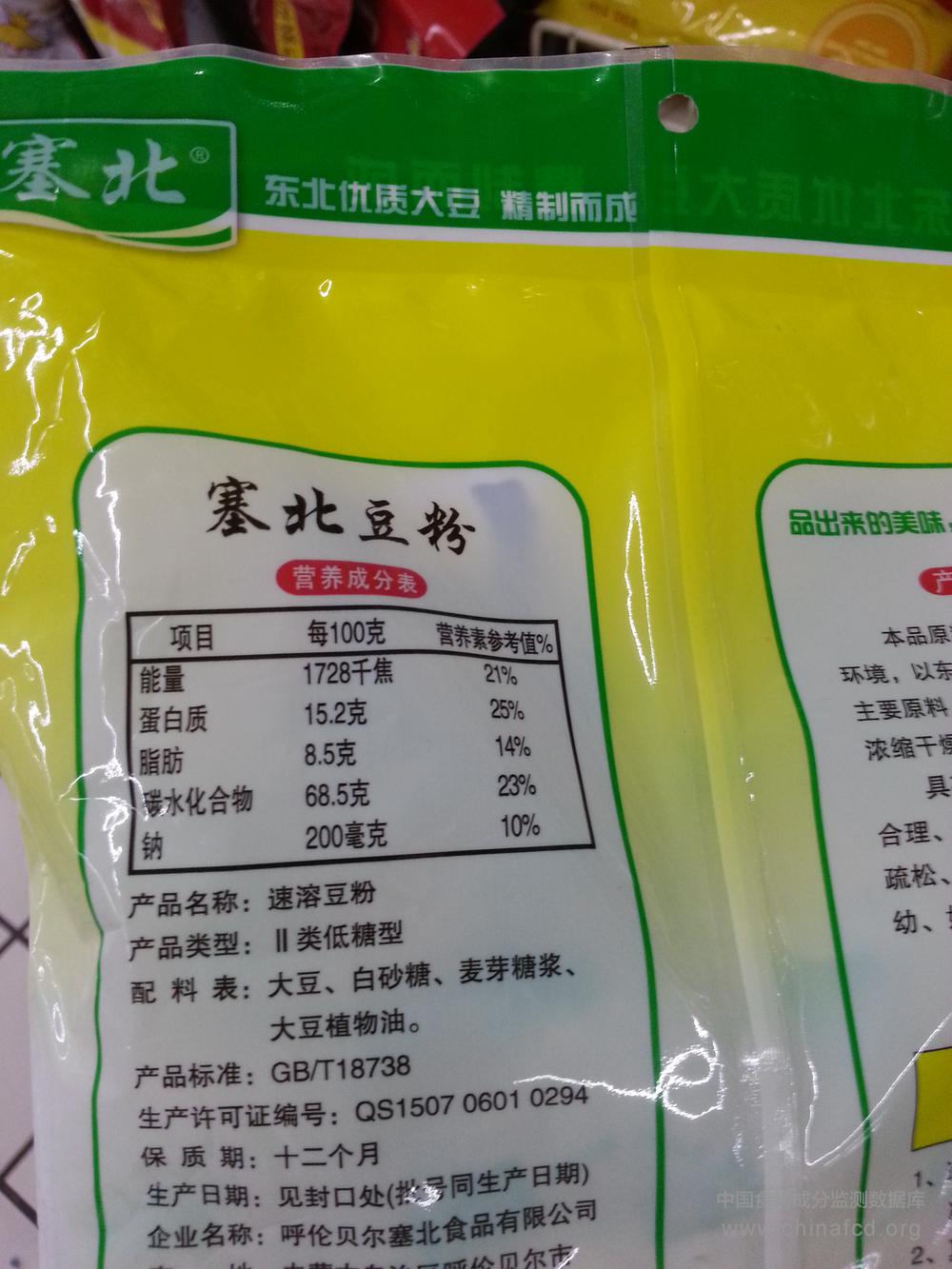 当前位置:预包装食品营养标签数据查询系统>>塞北速溶豆粉
