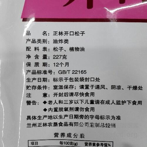 生产厂家:兰州正林农垦食品有限公司 L 品牌:正林 食物类别:坚果、种子类-树坚果--松子 配料:松子、植物油 净含量:227g 条形码/识别码:6920509090200 储存方法:室温保存;请置于通风、阴凉、干燥处。 产地:甘肃省兰州市