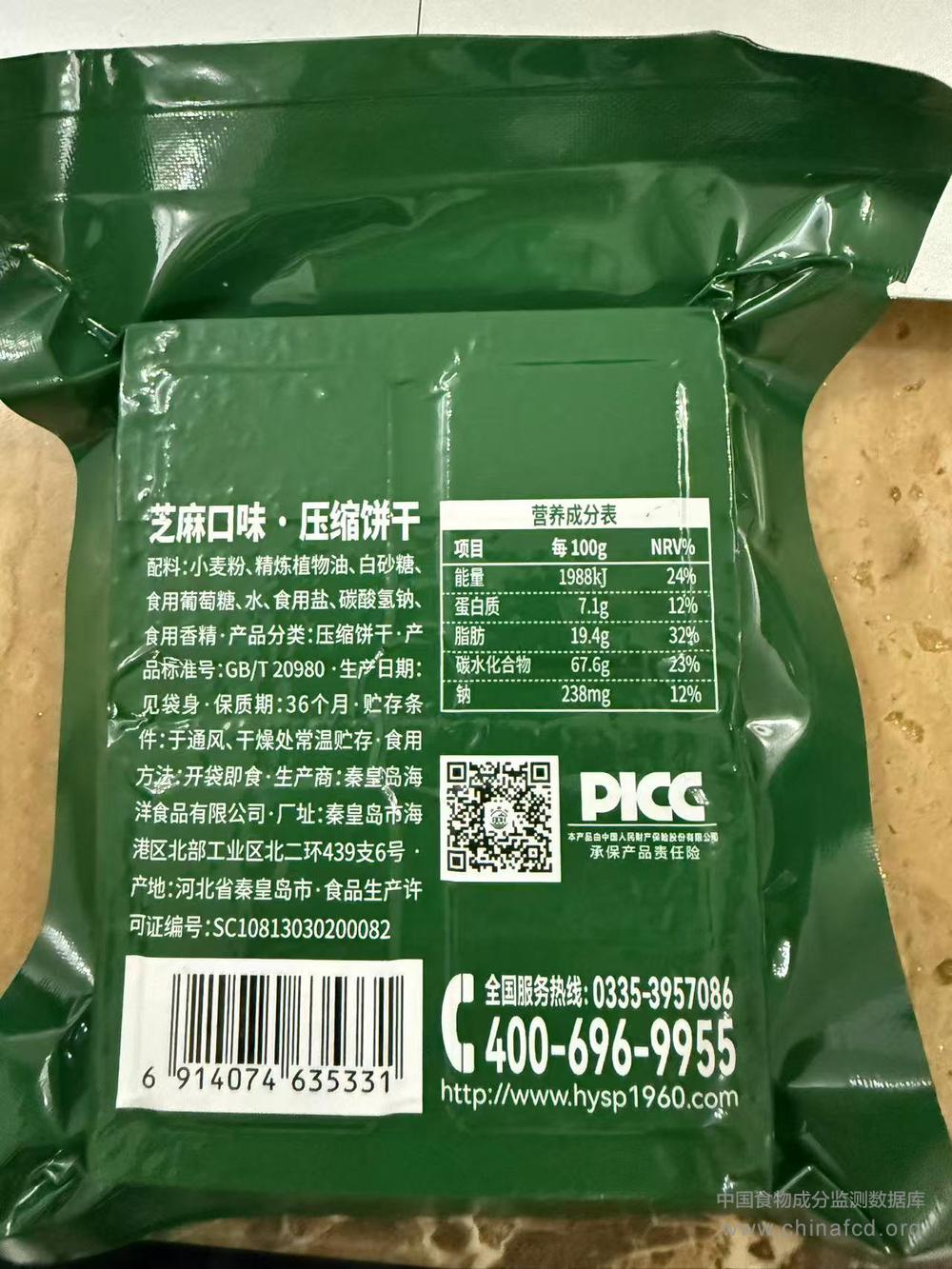 生产厂家:秦皇岛海洋食品有限公司 品牌:四OO三工厂 食物类别:休闲食品-饼干、面包-饼干-其他 配料:小麦粉、精炼植物油、白砂糖、食用葡萄糖、水、食用盐、碳酸氢钠、食用香精 净含量:120g 条形码/识别码:6914074635331 储存方法:于通风、干燥处常温贮存 产地:河北省秦皇岛市