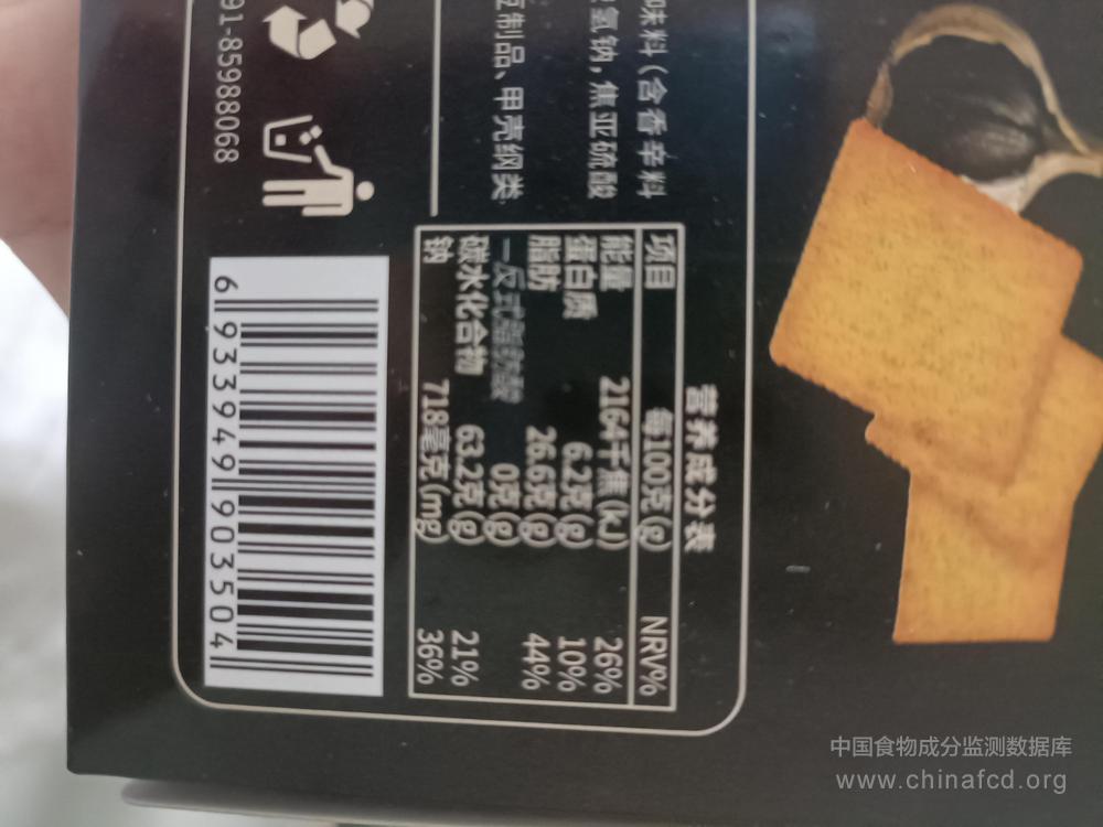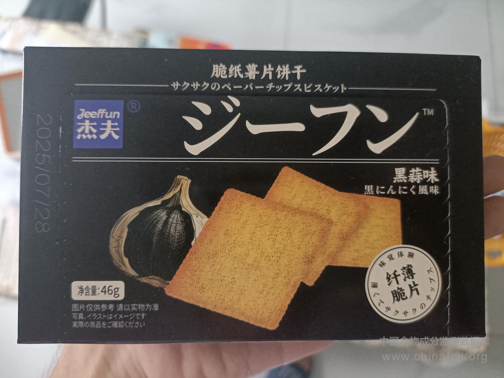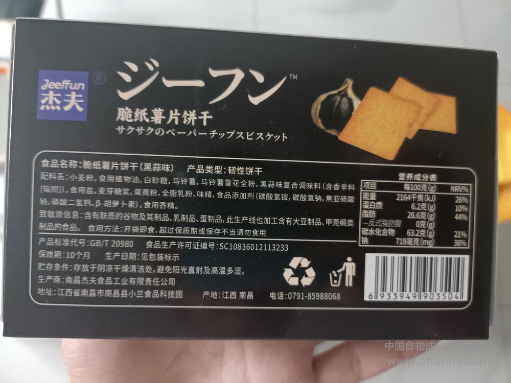 生产厂家:南昌杰夫食品工业有限责任公司 品牌:杰夫 食物类别:休闲食品-饼干、面包-饼干-其他 配料:小麦粉,食用植物油,白砂糖,马铃薯,马铃薯雪花全粉;黑蒜味复合调味料(含香辛料(辐照)),食用盐,麦芽糖浆,蛋黄粉,全脂乳粉,味精,食品添加剂(碳酸氢铵,碳酸氢钠,焦亚硫酸钠,磷酸二藝钙,β-胡萝卜素),食用香精。 净含量:46g 条形码/识别码:6933949903504 储存方法:请置于阴凉干燥处,避免阳光直射。 产地:江西南昌