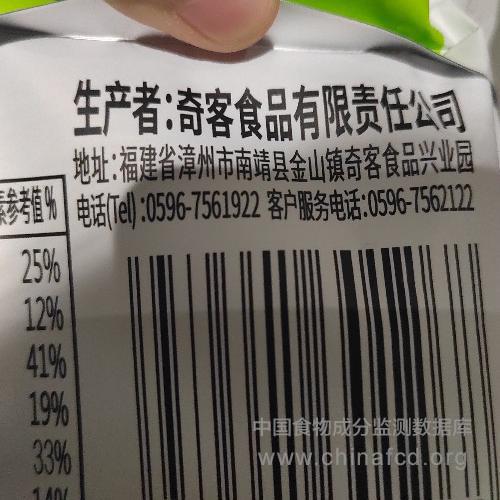 生产厂家:奇客食品有限责任公司 品牌:奇客 食物类别:休闲食品-饼干、面包-饼干-其他 配料:小麦粉,食用植物油,全麦粉(添加量11.8%),白砂糖,麦麸(添加量11.2%),食用玉米淀粉,鸡蛋,麦芽糖浆,脱水香葱(添加量0.8%),燕麦片,洋葱粉,食用盐,碳酸氢铵,碳酸氢钠,磷酸氢钙,食用香精,5‘-呈味核苷酸二钠。 净含量:403g 条形码/识别码:6936341301077 储存方法:存放于阴凉干燥处,避免阳光直射。 产地:福建省漳州市